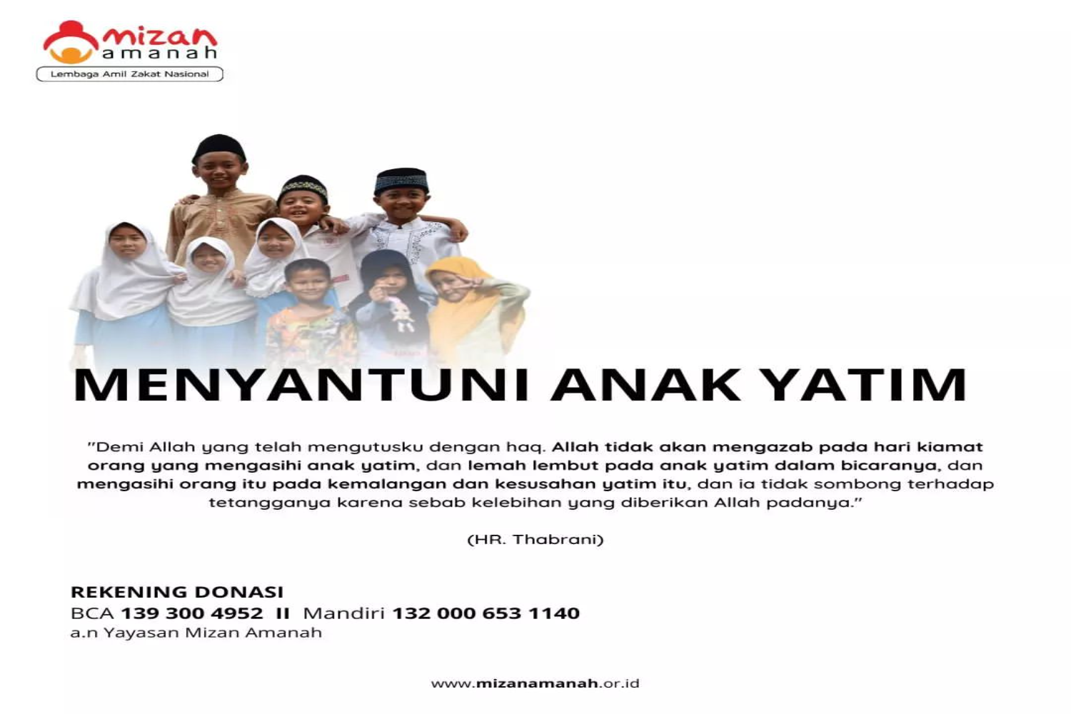 Dengan menyantuni, memelihara dan memuliakan anak yatim, kita memiliki peluang untuk mendapatkan keutamaan langsung dari Allah dan Rasul Nya sebagaimana yang telah dijelaskan di atas. Sebagaimana menyantuni anak yatim pun bisa secara online. Jika Anda ingin mendapatkan keutamaan-keutamaan di atas, salurkan santunan Anda untuk Anak-anak Yatim di 50 Panti Asuhan 10 Rumah Belajar dan 1 pesantren binaan LAZ Mizan Amanah melalui www.mizanamanah.or.id
